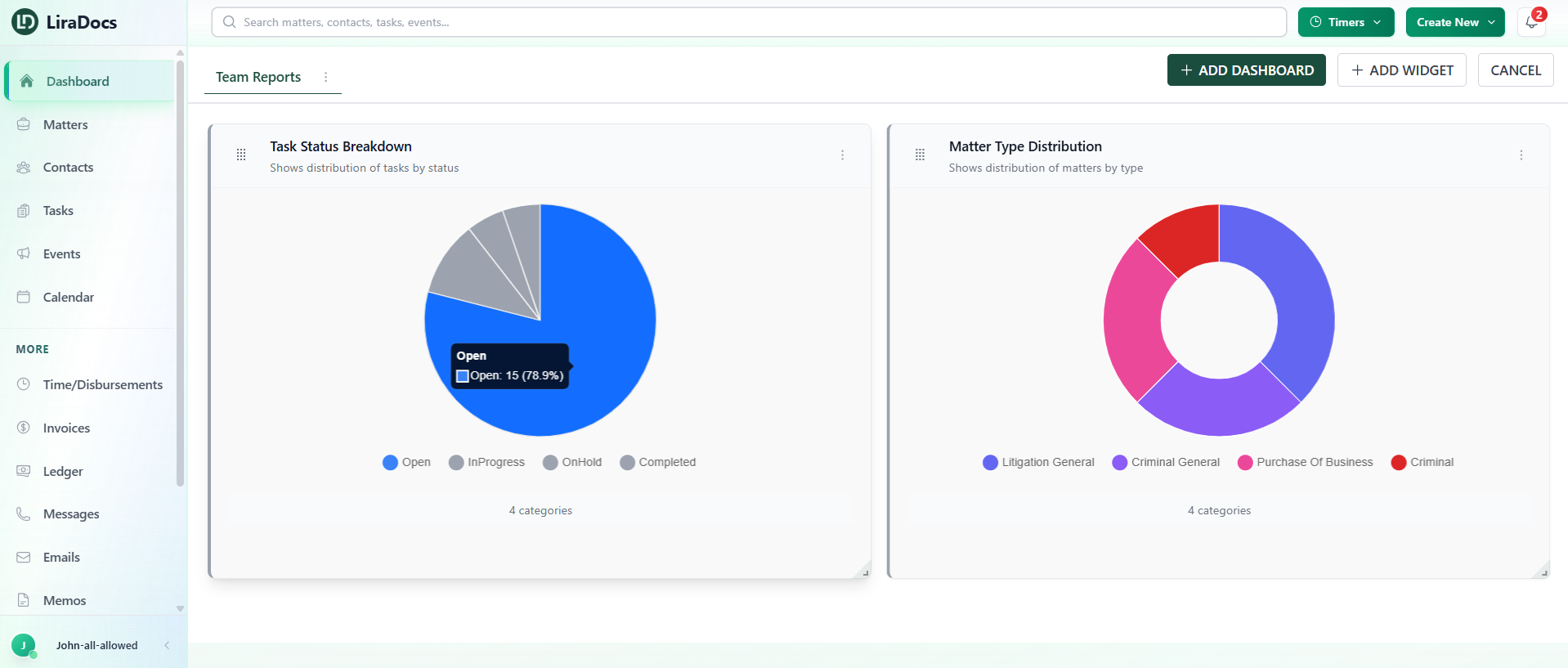 Unlock the full potential of your firm with Liradocs’ advanced analytics. Actionable insights into your cases, clients, and opportunities help you run a more efficient and profitable practice.